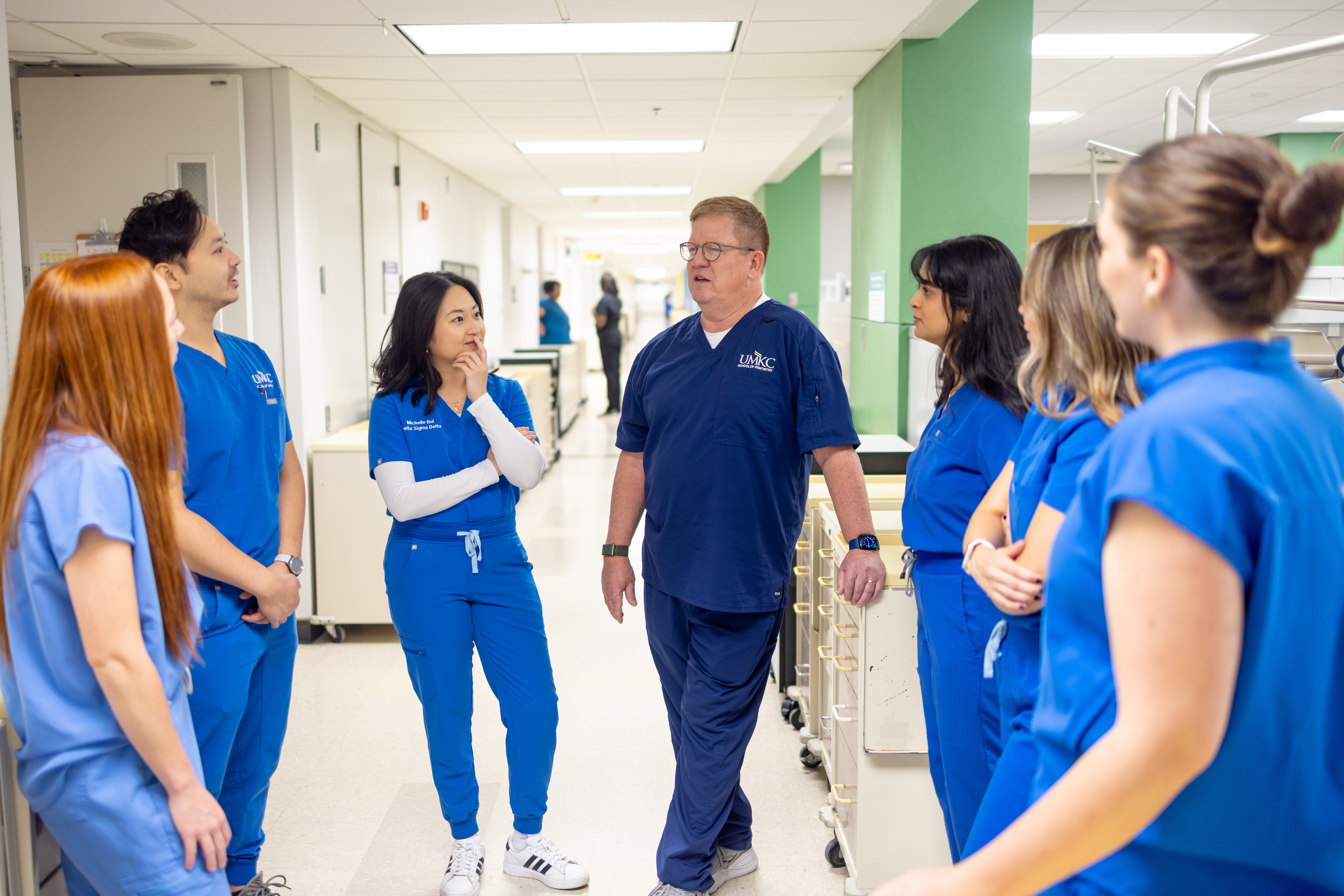 Dean Luepke chats with students at the University of Missouri - Kansas City School of Dentistry.
